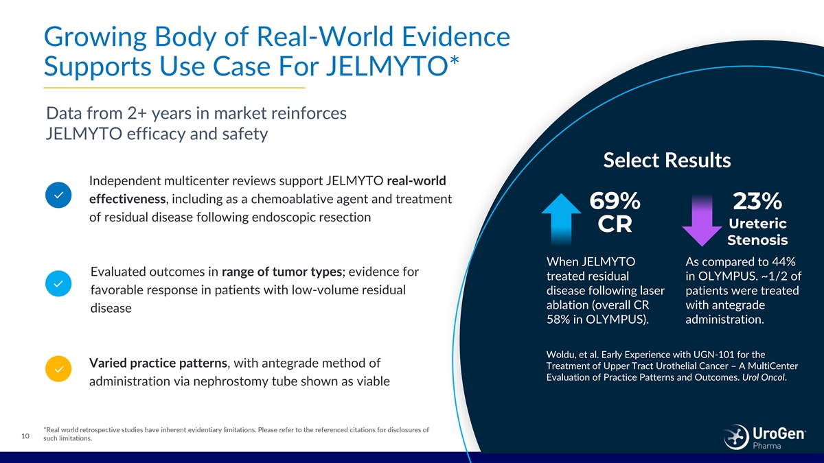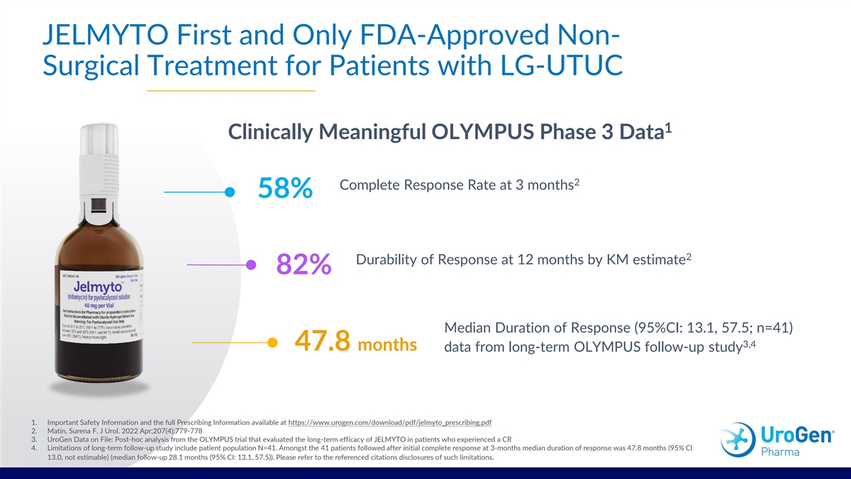 JELMYTO First and Only FDA-Approved Non- Surgical Treatment for Patients with LG-UTUC 1 Clinically Meaningful OLYMPUS Phase 3 Data 2 Complete Response Rate at 3 months 58% 2 Durability of Response at 12 months by KM estimate 82% Median Duration of Response (95%CI: 13.1, 57.5; n=41) 3,4 47.8 months data from long-term OLYMPUS follow-up study 1. Important Safety Information and the full Prescribing Information available at https://www.urogen.com/download/pdf/jelmyto_prescribing.pdf 2. Matin, Surena F. J Urol. 2022 Apr;207(4):779-778 3. UroGen Data on File: Post-hoc analysis from the OLYMPUS trial that evaluated the long-term efficacy of JELMYTO in patients who experienced a CR 4. Limitations of long-term follow-up study include patient population N=41. Amongst the 41 patients followed after initial complete response at 3-months median duration of response was 47.8 months (95% CI 9 9 13.0, not estimable) (median follow-up 28.1 months (95% CI: 13.1, 57.5)). Please refer to the referenced citations disclosures of such limitations.