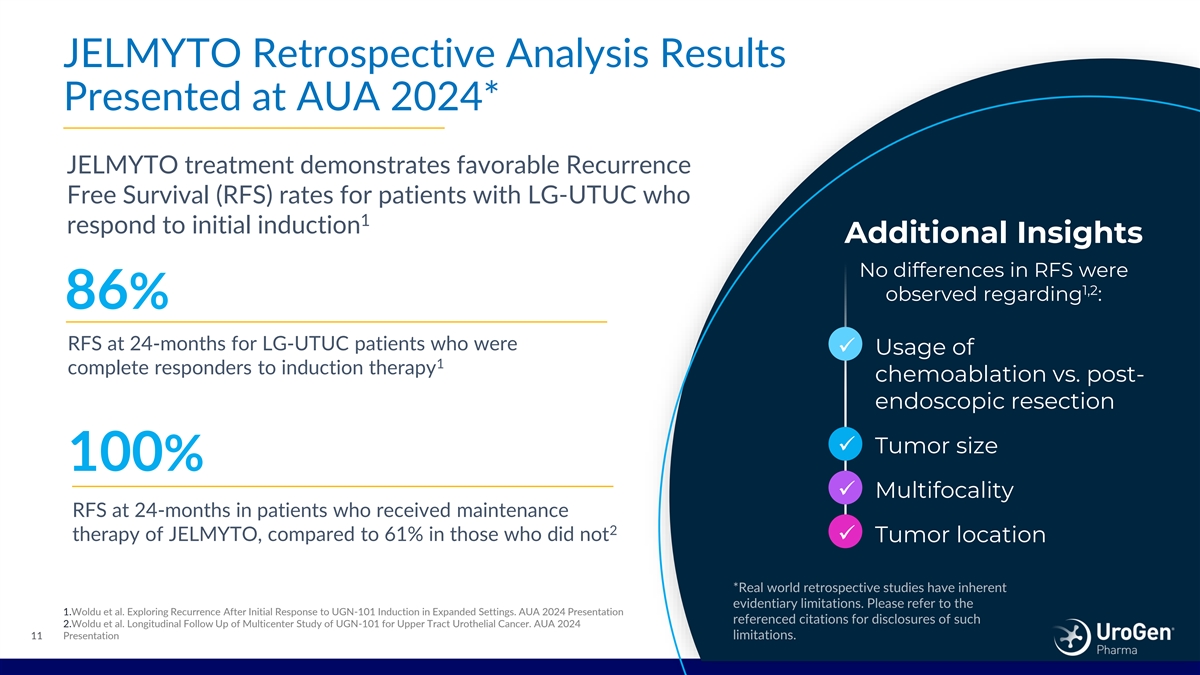 Growing Body of Real-World Evidence Supports Use Case For JELMYTO* Data from 2+ years in market reinforces JELMYTO efficacy and safety Select Results Independent multicenter reviews support JELMYTO real-world effectiveness, including as a chemoablative agent and treatment 69% 23% of residual disease following endoscopic resection Ureteric CR Stenosis When JELMYTO As compared to 44% Evaluated outcomes in range of tumor types; evidence for treated residual in OLYMPUS. ~1/2 of favorable response in patients with low-volume residual disease following laser patients were treated ablation (overall CR with antegrade disease 58% in OLYMPUS). administration. Woldu, et al. Early Experience with UGN-101 for the Varied practice patterns, with antegrade method of Treatment of Upper Tract Urothelial Cancer – A MultiCenter Evaluation of Practice Patterns and Outcomes. Urol Oncol. administration via nephrostomy tube shown as viable *Real world retrospective studies have inherent evidentiary limitations. Please refer to the referenced citations for disclosures of 10 such limitations.