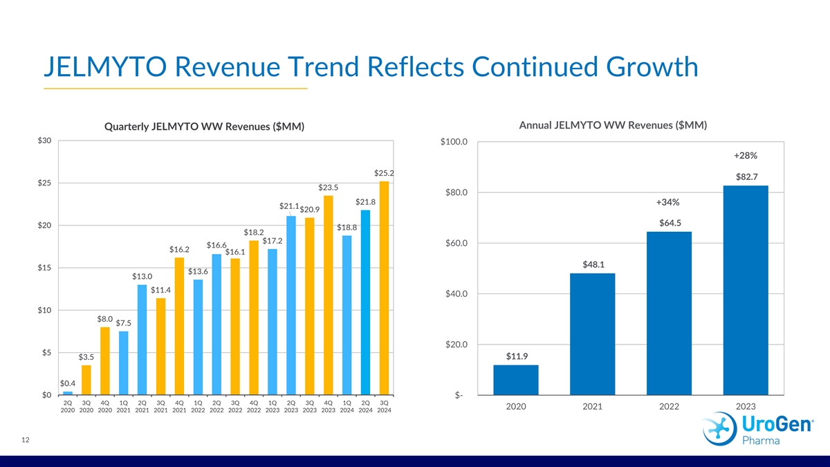 JELMYTO Revenue Trend Reflects Continued Growth Annual JELMYTO WW Revenues ($MM) Quarterly JELMYTO WW Revenues ($MM) $30 $100.0 +28% $25.2 $82.7 $25 $23.5 $80.0 $21.8 +34% $21.1 $20.9 $64.5 $20 $18.8 $18.2 $17.2 $60.0 $16.6 $16.2 $16.1 $48.1 $15 $13.6 $13.0 $11.4 $40.0 $10 $8.0 $7.5 $20.0 $5 $3.5 $11.9 $0.4 $0 $- 2Q 3Q 4Q 1Q 2Q 3Q 4Q 1Q 2Q 3Q 4Q 1Q 2Q 3Q 4Q 1Q 2Q 3Q 2020 2021 2022 2023 2020 2020 2020 2021 2021 2021 2021 2022 2022 2022 2022 2023 2023 2023 2023 2024 2024 2024 12