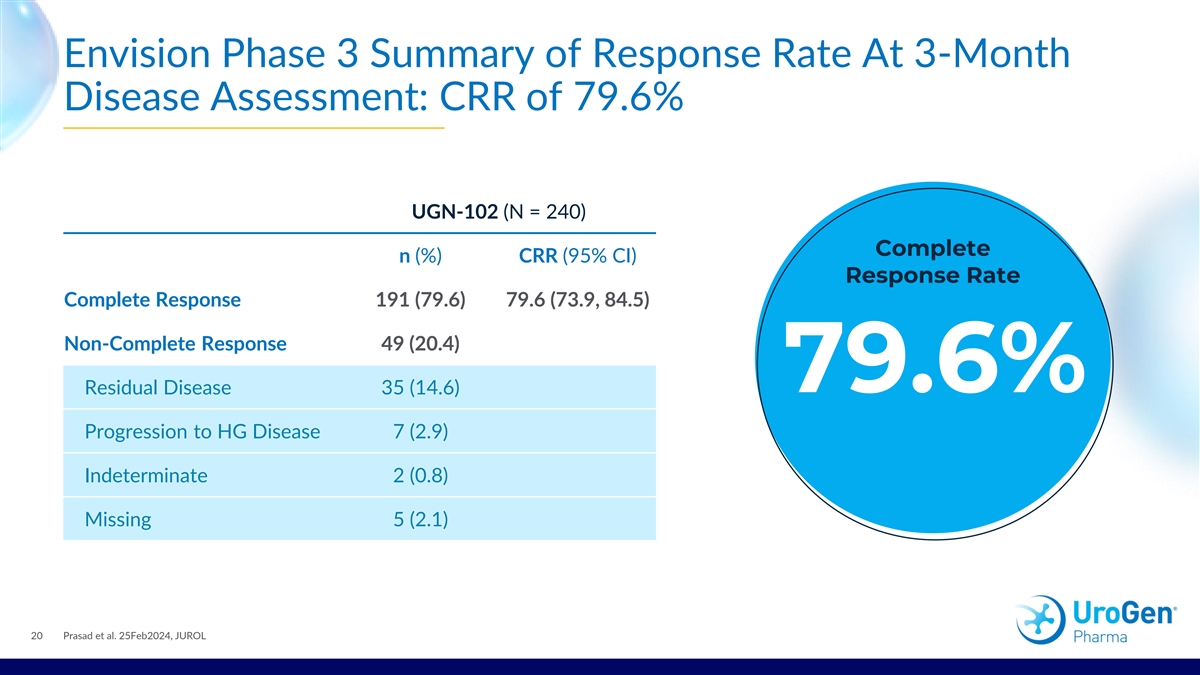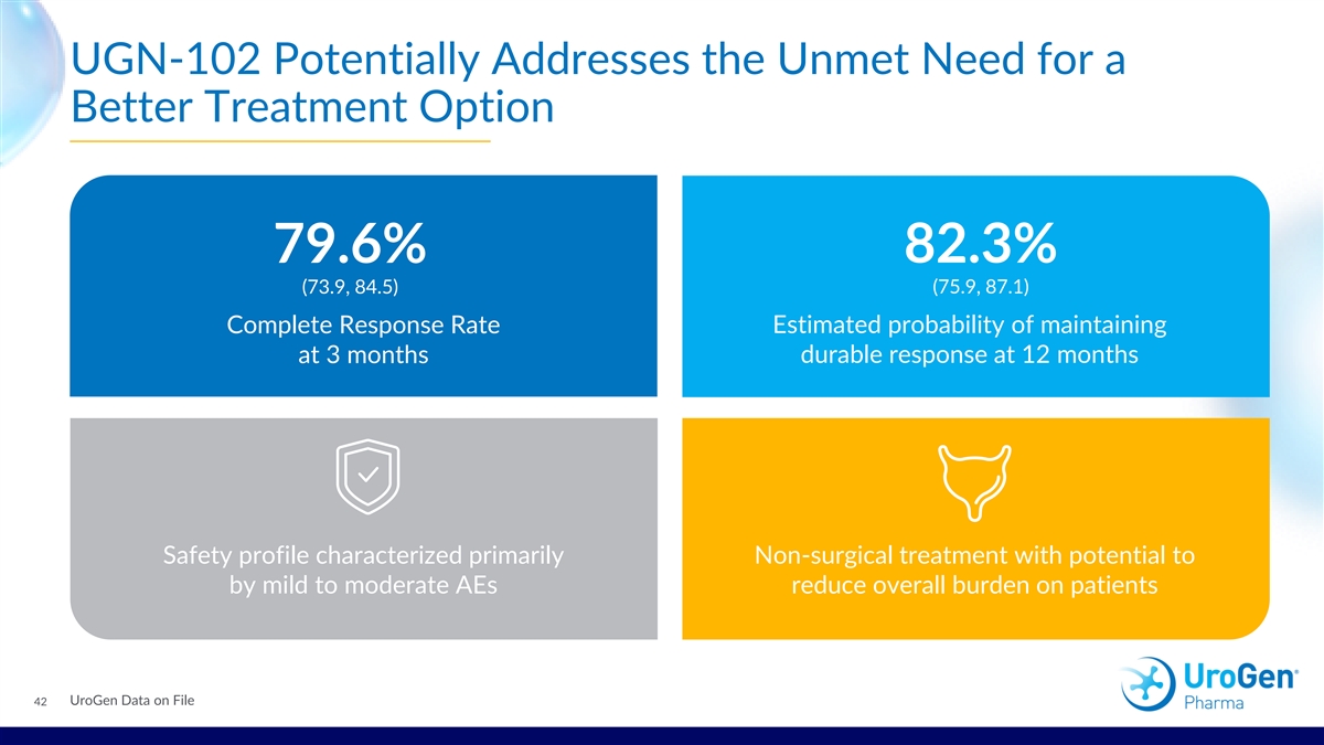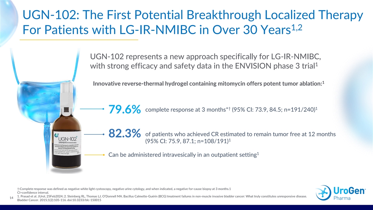 UGN-102: The First Potential Breakthrough Localized Therapy 1,2 For Patients with LG-IR-NMIBC in Over 30 Years UGN-102 represents a new approach specifically for LG-IR-NMIBC, 1 with strong efficacy and safety data in the ENVISION phase 3 trial 1 Innovative reverse-thermal hydrogel containing mitomycin offers potent tumor ablation: † 1 complete response at 3 months* (95% CI: 73.9, 84.5; n=191/240) 79.6% of patients who achieved CR estimated to remain tumor free at 12 months 82.3% 1 (95% CI: 75.9, 87.1; n=108/191) 1 Can be administered intravesically in an outpatient setting †:Complete response was defined as negative white light cystoscopy, negative urine cytology, and when indicated, a negative for-cause biopsy at 3 months.1 CI=confidence interval. 1. Prasad et al. JUrol, 25Feb2024; 2. Steinberg RL, Thomas LJ, O’Donnell MA. Bacillus Calmette-Guérin (BCG) treatment failures in non-muscle invasive bladder cancer: What truly constitutes unresponsive disease. 14 Bladder Cancer. 2015;1(2):105-116. doi:10.3233/blc-150015
