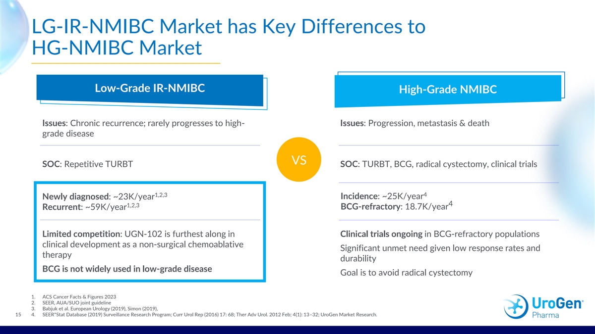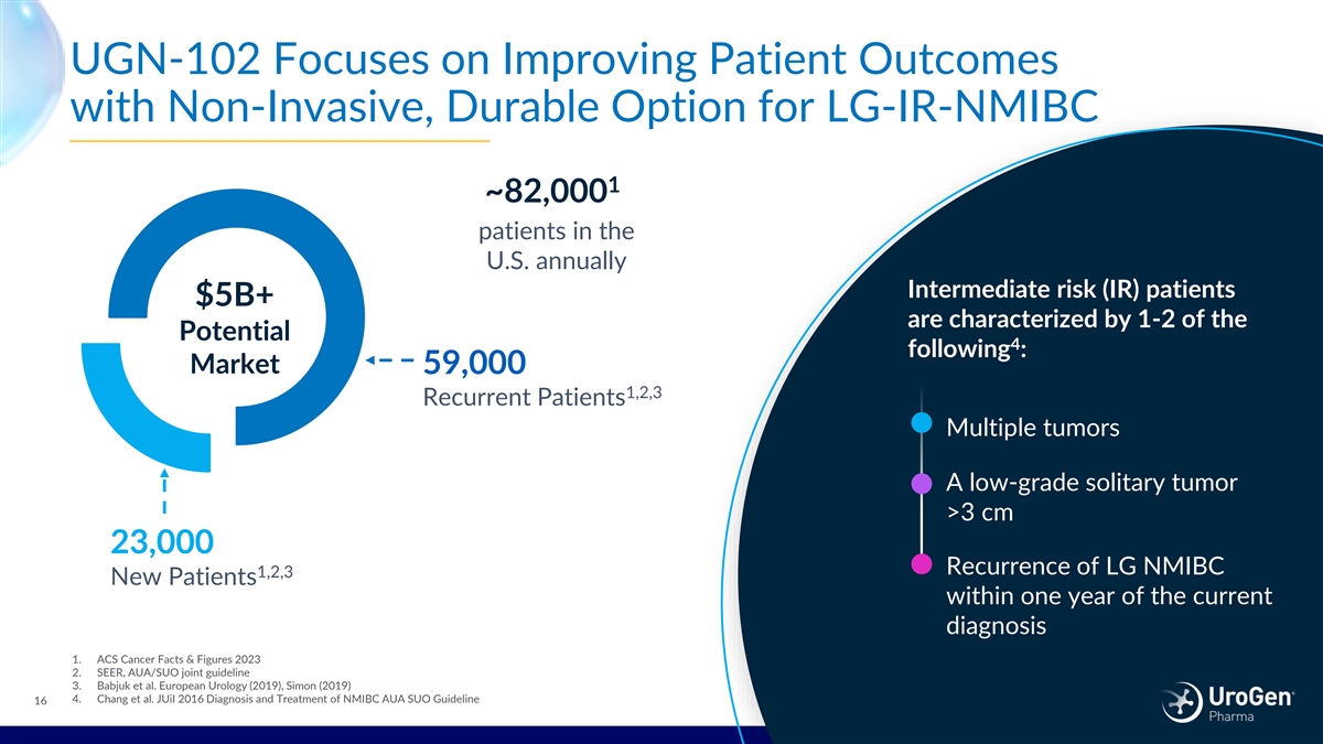 LG-IR-NMIBC Market has Key Differences to HG-NMIBC Market Low-Grade IR-NMIBC High-Grade NMIBC Issues: Chronic recurrence; rarely progresses to high- Issues: Progression, metastasis & death grade disease VS SOC: Repetitive TURBT SOC: TURBT, BCG, radical cystectomy, clinical trials 4 1,2,3 Incidence: ~25K/year Newly diagnosed: ~23K/year 4 1,2,3 BCG-refractory: 18.7K/year Recurrent: ~59K/year Limited competition: UGN-102 is furthest along in C Clini linic ca al l t tr rials ials ongoing ongoing in in BCG BCG- -r refr efracto actor ry y p populatio opulations ns clinical development as a non-surgical chemoablative S Signif ignifican icant t un unmet met need need given given llow re ow resp spon onse se r rates ates an and d therapy d du urab rability ility BCG is not widely used in low-grade disease G Goa oall is is to to av avoi oid d r radical adical cystect cystectom omy y 1. ACS Cancer Facts & Figures 2023 2. SEER, AUA/SUO joint guideline 3. Babjuk et al. European Urology (2019), Simon (2019), 15 4. SEER*Stat Database (2019) Surveillance Research Program; Curr Urol Rep (2016) 17: 68; Ther Adv Urol. 2012 Feb; 4(1): 13–32; UroGen Market Research.