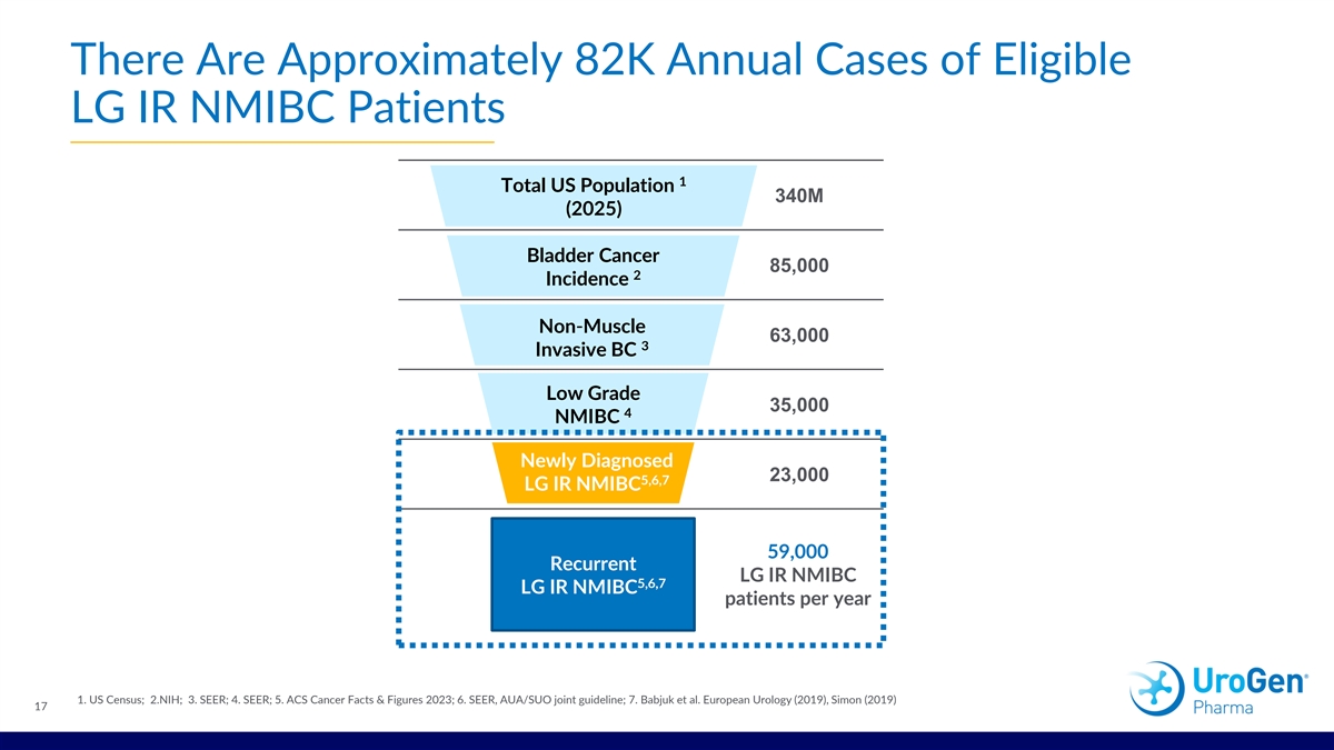 UGN-102 Focuses on Improving Patient Outcomes with Non-Invasive, Durable Option for LG-IR-NMIBC 1 ~82,000 patients in the U.S. annually Intermediate risk (IR) patients $5B+ are characterized by 1-2 of the Potential 4 following : Market 59,000 1,2,3 Recurrent Patients Multiple tumors A low-grade solitary tumor >3 cm 23,000 Recurrence of LG NMIBC 1,2,3 New Patients within one year of the current diagnosis 1. ACS Cancer Facts & Figures 2023 2. SEER, AUA/SUO joint guideline 3. Babjuk et al. European Urology (2019), Simon (2019) 4. Chang et al. JUiI 2016 Diagnosis and Treatment of NMIBC AUA SUO Guideline 16