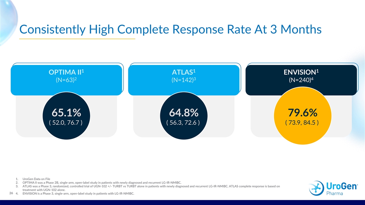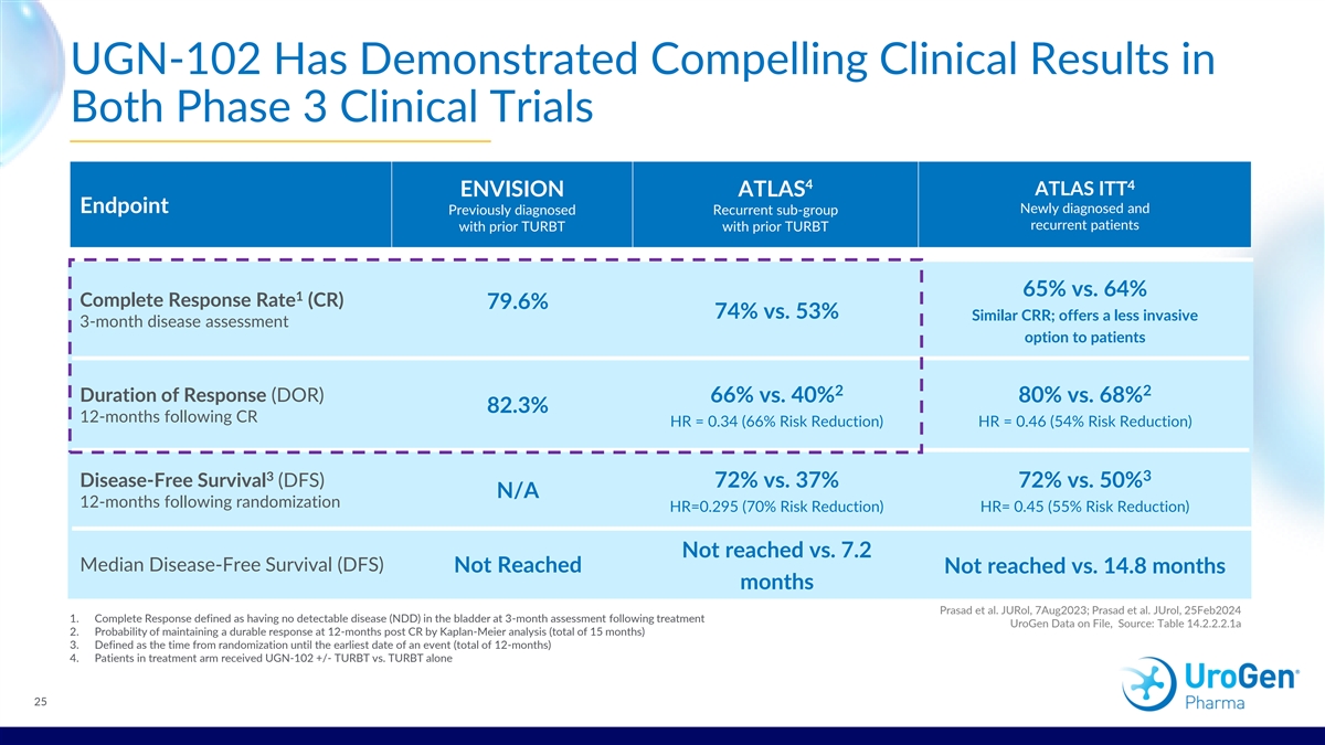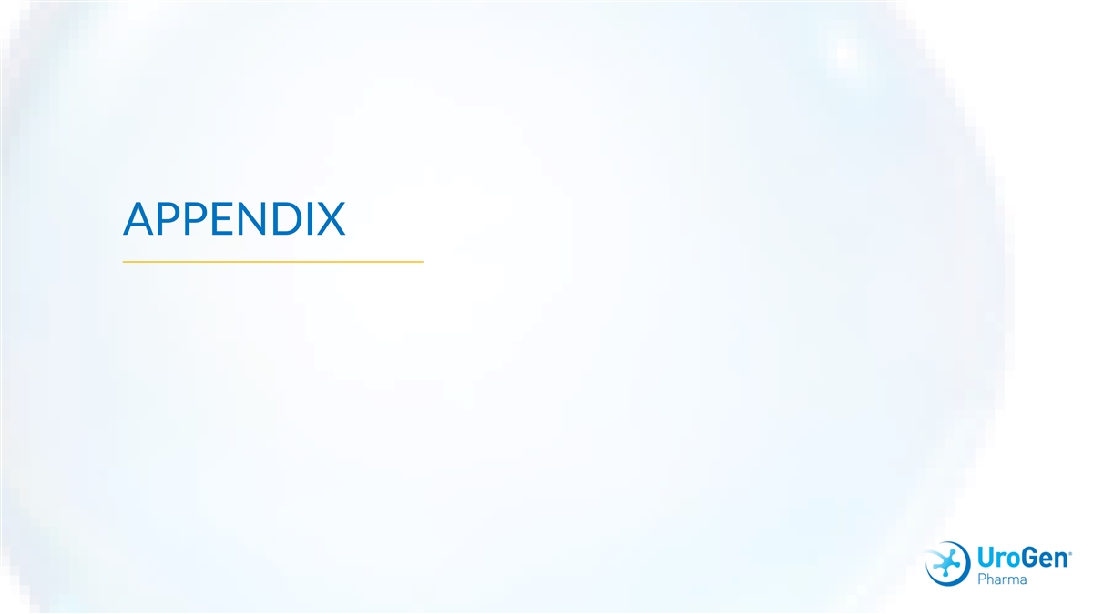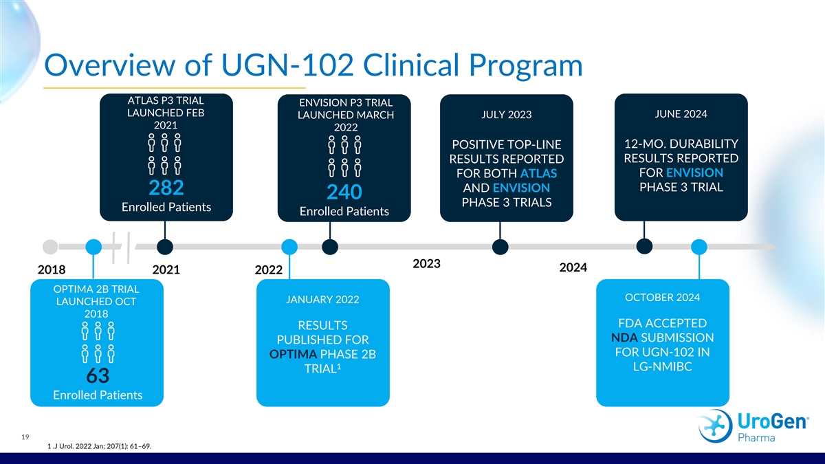 Overview of UGN-102 Clinical Program ATLAS P3 TRIAL ENVISION P3 TRIAL LAUNCHED FEB JUNE 2024 LAUNCHED MARCH JULY 2023 2021 2022 12-MO. DURABILITY POSITIVE TOP-LINE RESULTS REPORTED RESULTS REPORTED FOR ENVISION FOR BOTH ATLAS PHASE 3 TRIAL AND ENVISION 282 240 PHASE 3 TRIALS Enrolled Patients Enrolled Patients 2023 2024 2018 2021 2022 OPTIMA 2B TRIAL OCTOBER 2024 JANUARY 2022 LAUNCHED OCT 2018 FDA ACCEPTED RESULTS NDA SUBMISSION PUBLISHED FOR FOR UGN-102 IN OPTIMA PHASE 2B 1 LG-NMIBC TRIAL 63 Enrolled Patients 19 1 .J Urol. 2022 Jan; 207(1): 61–69.