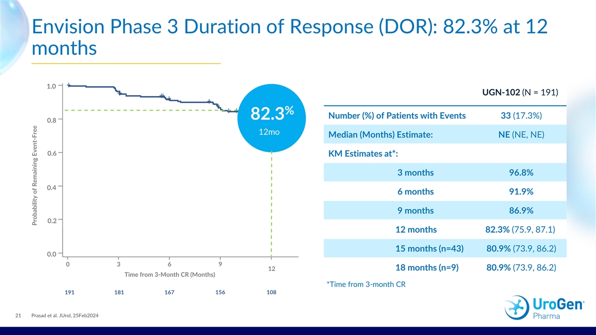 Envision Phase 3 Summary of Response Rate At 3-Month Disease Assessment: CRR of 79.6% UGN-102 (N = 240) Complete n (%) CRR (95% CI) Response Rate Complete Response 191 (79.6) 79.6 (73.9, 84.5) Non-Complete Response 49 (20.4) 79.6% Residual Disease 35 (14.6) Progression to HG Disease 7 (2.9) Indeterminate 2 (0.8) Missing 5 (2.1) 20 Prasad et al. 25Feb2024, JUROL