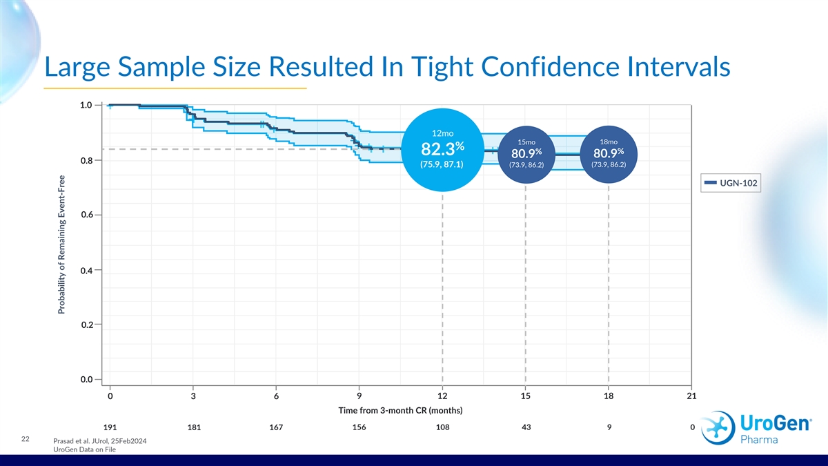Large Sample Size Resulted In Tight Confidence Intervals 1.0 12mo 18mo 15mo % % % 82.3 80.9 80.9 0.8 (75.9, 87.1) (73.9, 86.2) (73.9, 86.2) UGN-102 0.6 0.4 0.2 0.0 9 12 15 18 21 0 3 6 Time from 3-month CR (months) 156 108 43 9 0 191 181 167 22 Prasad et al. JUrol, 25Feb2024 UroGen Data on File Probability of Remaining Event-Free