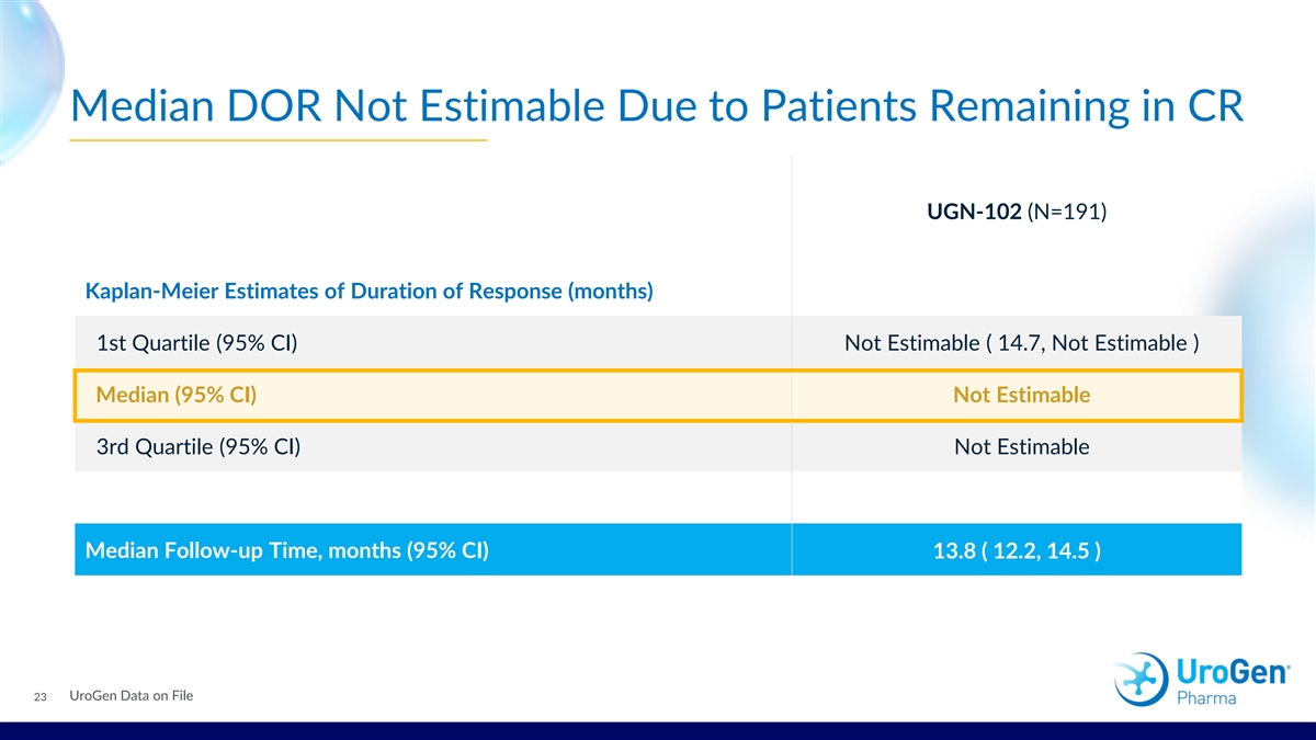 Median DOR Not Estimable Due to Patients Remaining in CR UGN-102 (N=191) Kaplan-Meier Estimates of Duration of Response (months) 1st Quartile (95% CI) Not Estimable ( 14.7, Not Estimable ) Median (95% CI) Not Estimable 3rd Quartile (95% CI) Not Estimable Median Follow-up Time, months (95% CI) 13.8 ( 12.2, 14.5 ) UroGen Data on File 23