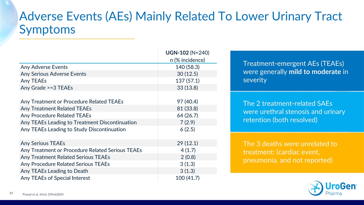 Adverse Events (AEs) Mainly Related To Lower Urinary Tract Symptoms UGN-102 (N=240) n (% incidence) Treatment-emergent AEs (TEAEs) Any Adverse Events 140 (58.3) were generally mild to moderate in Any Serious Adverse Events 30 (12.5) severity Any TEAEs 137 (57.1) Any Grade >=3 TEAEs 33 (13.8) Any Treatment or Procedure Related TEAEs 97 (40.4) The 2 treatment-related SAEs Any Treatment Related TEAEs 81 (33.8) were urethral stenosis and urinary Any Procedure Related TEAEs 64 (26.7) retention (both resolved) Any TEAEs Leading to Treatment Discontinuation 7 (2.9) Any TEAEs Leading to Study Discontinuation 6 (2.5) Any Serious TEAEs 29 (12.1) The 3 deaths were unrelated to Any Treatment or Procedure Related Serious TEAEs 4 (1.7) treatment: (cardiac event, Any Treatment Related Serious TEAEs 2 (0.8) pneumonia, and not reported) Any Procedure Related Serious TEAEs 3 (1.3) Any TEAEs Leading to Death 3 (1.3) Any TEAEs of Special Interest 100 (41.7) 24 Prasad et al. JUrol, 25Feb2024