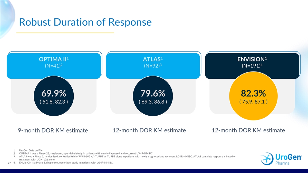 Consistently High Complete Response Rate At 3 Months 1 1 1 OPTIMA II ATLAS ENVISION 2 3 4 (N=63) (N=142) (N=240) 65.1% 64.8% 79.6% ( 52.0, 76.7 ) ( 56.3, 72.6 ) ( 73.9, 84.5 ) 1. UroGen Data on File 2. OPTIMA II was a Phase 2B, single-arm, open-label study in patients with newly diagnosed and recurrent LG-IR-NMIBC. 3. ATLAS was a Phase 3, randomized, controlled trial of UGN-102 +/- TURBT vs TURBT alone in patients with newly diagnosed and recurrent LG-IR-NMIBC. ATLAS complete response is based on treatment with UGN-102 alone. 26 4. ENVISION is a Phase 3, single-arm, open-label study in patients with LG-IR-NMIBC.