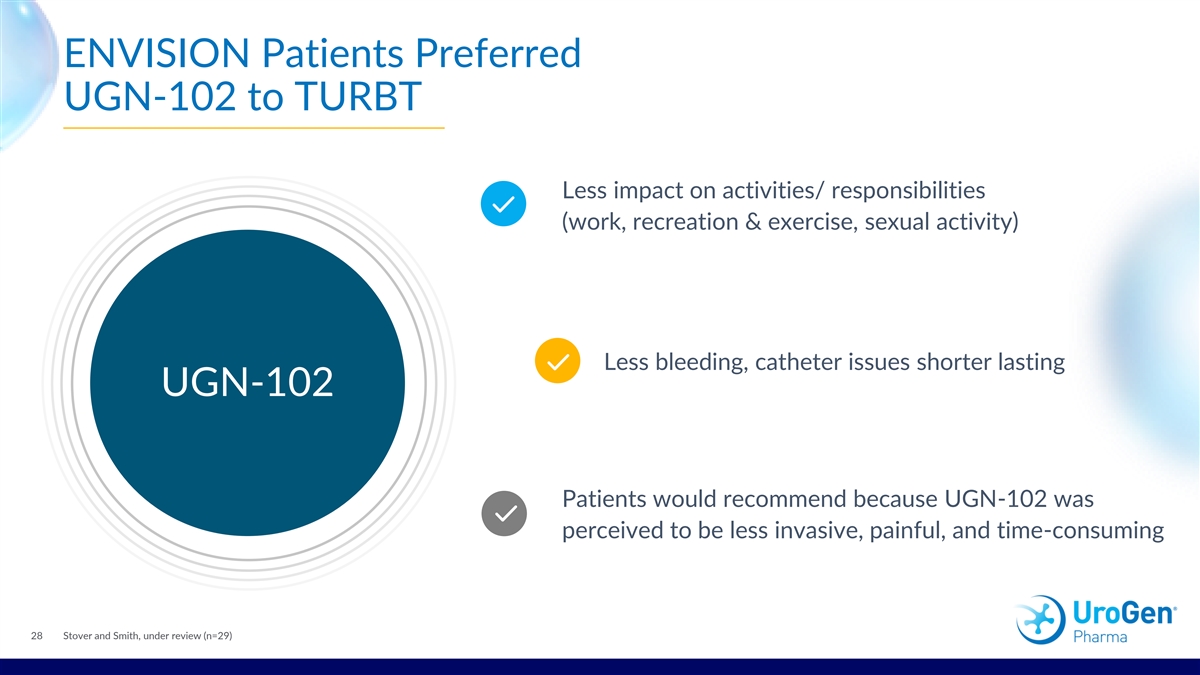 ENVISION Patients Preferred UGN-102 to TURBT Less impact on activities/ responsibilities (work, recreation & exercise, sexual activity) Less bleeding, catheter issues shorter lasting UGN-102 Patients would recommend because UGN-102 was perceived to be less invasive, painful, and time-consuming 28 Stover and Smith, under review (n=29)