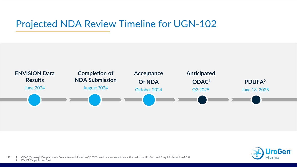 Projected NDA Review Timeline for UGN-102 ENVISION Data Completion of Acceptance Anticipated Results NDA Submission 1 2 Of NDA ODAC PDUFA June 2024 August 2024 October 2024 Q2 2025 June 13, 2025 1. ODAC (Oncologic Drugs Advisory Committee) anticipated in Q2 2025 based on most recent interactions with the U.S. Food and Drug Administration (FDA) 29 2. PDUFA Target Action Date