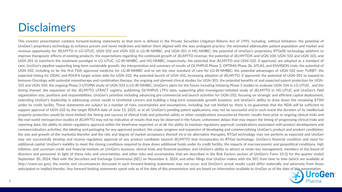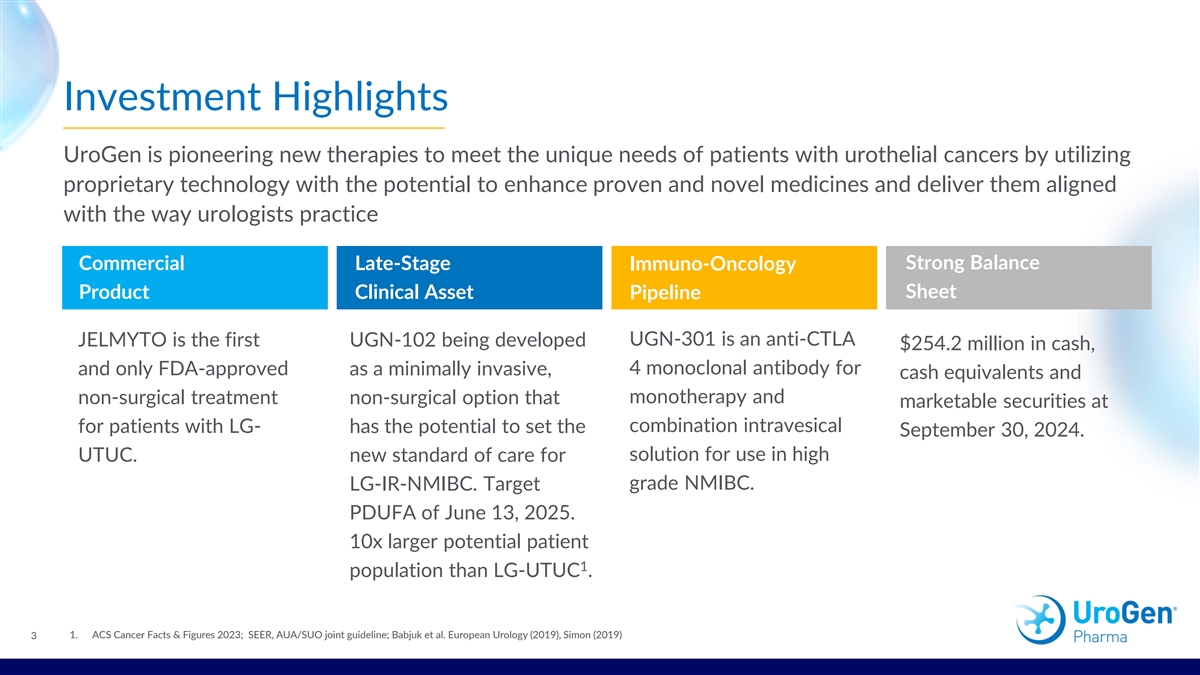 Disclaimers This investor presentation contains forward-looking statements as that term is defined in the Private Securities Litigation Reform Act of 1995, including, without limitation: the potential of UroGen’s proprietary technology to enhance proven and novel medicines and deliver them aligned with the way urologists practice; the estimated addressable patient population and market and revenue opportunity for JELMYTO in LG-UTUC, UGN-102 and UGN-103 in LG-IR-NMIBC, and UGN-301 in HG-NMIBC; the potential of UroGen’s proprietary RTGel® technology platform to improve therapeutic effects of existing products; the expectations regarding the continued growth of JELMYTO revenue; the potential of JELMYTO® and UGN-104, UGN-102 and UGN-103, and UGN-301 to transform the treatment paradigm in LG-UTUC, LG-IR-NMIBC, and HG-NMIBC, respectively; the potential that JELMYTO and UGN-102, if approved, are adopted as a standard of care; UroGen’s pipeline supporting long-term sustainable growth; the interpretation and summary of results of OLYMPUS Phase 3, OPTIMA Phase 2b, ATLAS, and ENVISION trials; the potential of UGN-102, including to be the first FDA approved medicine for LG-IR-NMIBC and to set the new standard of care for LG-IR-NMIBC; the potential advantages of UGN-102 over TURBT; the expected timing for ODAC and PDUFA target action date for UGN-102; the potential launch of UGN-102, increasing adoption of JELMYTO, if approved; the potential of UGN-301 to expand to Immuno-Oncology with potential monotherapy and combination therapy; the ongoing and planned clinical studies for UGN-301; the potential benefits of and expected patent protection for UGN- 103 and UGN-104; the ongoing Phase 3 UTOPIA study of UGN-103 in LG-IR-NMIBC; UroGen’s plans for the future including initiating Phase 3 studies to evaluate UGN-104 in LG-UTUC, and the timing thereof, the expansion of the JELMYTO uTRACT registry, publishing OLYMPUS LTFU data, supporting pilot investigator-initiated study of JELMYTO in HG-UTUC and UroGen’s field organization size, positions and responsibilities; UroGen’s priorities including advancing pre-commercial and launch activities for UGN-102; focusing on strategic and efficient capital deployment, extending UroGen’s leadership in addressing unmet needs in Urothelial cancers and building a long-term sustainable growth business; and UroGen’s ability to draw down the remaining $75M under its credit facility. These statements are subject to a number of risks, uncertainties and assumptions, including, but not limited to: there is no guarantee that the NDA will be sufficient to support approval of UGN-102 by the target PDUFA date of June 13, 2025, or at all; UroGen’s pending patent applications, may not be successful and in such event the duration of its intellectual property protection would be more limited; the timing and success of clinical trials and potential safety or other complications encountered therein; results from prior or ongoing clinical trials and the real-world retrospective studies of JELMYTO may not be indicative of results that may be observed in the future; unforeseen delays that may impact the timing of progressing clinical trials and reporting data; the ability to obtain regulatory approval within the timeframe expected, or at all; the ability to maintain regulatory approval; complications associated with product development and commercialization activities; the labeling and packaging for any approved product; the scope, progress and expansion of developing and commercializing UroGen’s product and product candidates; the size and growth of the market(s) therefor and the rate and degree of market acceptance thereof vis-à-vis alternative therapies; RTGel technology may not perform as expected and UroGen may not successfully develop and receive regulatory approval of any product candidate beyond JELMYTO that incorporates its RTGel technology; UroGen’s financial condition and need for additional capital; UroGen’s inability to meet the closing conditions required to draw down additional funds under its credit facility; the impacts of macroeconomic and geopolitical conditions, high inflation, and uncertain credit and financial markets on UroGen’s business, clinical trials and financial position; and UroGen’s ability to attract or retain key management, members of the board of directors and personnel. In light of these risks and uncertainties, and other risks and uncertainties that are described in the Risk Factors section of UroGen’s Form 10-Q for the quarter ended September 30, 2024, filed with the Securities and Exchange Commission (SEC) on November 6, 2024, and other filings that UroGen makes with the SEC from time to time (which are available at http://www.sec.gov), the events and circumstances discussed in such forward-looking statements may not occur, and UroGen’s actual results could differ materially and adversely from those anticipated or implied thereby. Any forward-looking statements speak only as of the date of this presentation and are based on information available to UroGen as of the date of this presentation. 2