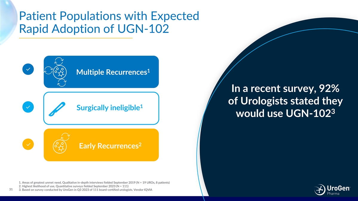 Patient Populations with Expected Rapid Adoption of UGN-102 1 Multiple Recurrences In a recent survey, 92% of Urologists stated they 1 Surgically ineligible 3 would use UGN-102 2 Early Recurrences 1. Areas of greatest unmet need, Qualitative in-depth interviews fielded September 2019 (N = 19 UROs, 8 patients) 2. Highest likelihood of use, Quantitative surveys fielded September 2023 (N = 111) 31 3. Based on survey conducted by UroGen in Q3 2023 of 111 board-certified urologists. Vendor IQVIA
