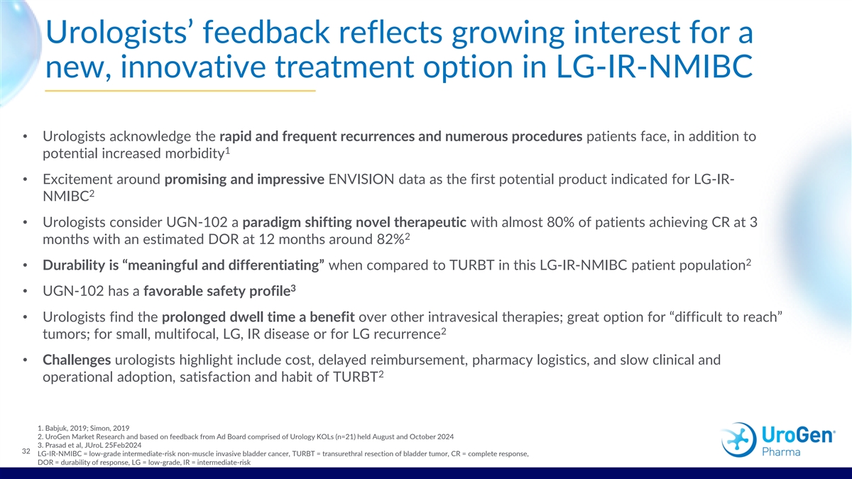 Urologists’ feedback reflects growing interest for a new, innovative treatment option in LG-IR-NMIBC • Urologists acknowledge the rapid and frequent recurrences and numerous procedures patients face, in addition to 1 potential increased morbidity • Excitement around promising and impressive ENVISION data as the first potential product indicated for LG-IR- 2 NMIBC • Urologists consider UGN-102 a paradigm shifting novel therapeutic with almost 80% of patients achieving CR at 3 2 months with an estimated DOR at 12 months around 82% 2 • Durability is “meaningful and differentiating” when compared to TURBT in this LG-IR-NMIBC patient population 3 • UGN-102 has a favorable safety profile • Urologists find the prolonged dwell time a benefit over other intravesical therapies; great option for “difficult to reach” 2 tumors; for small, multifocal, LG, IR disease or for LG recurrence • Challenges urologists highlight include cost, delayed reimbursement, pharmacy logistics, and slow clinical and 2 operational adoption, satisfaction and habit of TURBT 1. Babjuk, 2019; Simon, 2019 2. UroGen Market Research and based on feedback from Ad Board comprised of Urology KOLs (n=21) held August and October 2024 3. Prasad et al, JUroL 25Feb2024 32 LG-IR-NMIBC = low-grade intermediate-risk non-muscle invasive bladder cancer, TURBT = transurethral resection of bladder tumor, CR = complete response, DOR = durability of response, LG = low-grade, IR = intermediate-risk