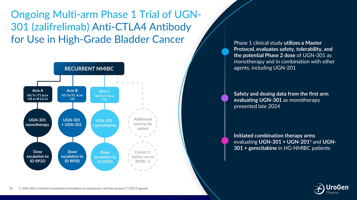Ongoing Multi-arm Phase 1 Trial of UGN- 301 (zalifrelimab) Anti-CTLA4 Antibody for Use in High-Grade Bladder Cancer Phase 1 clinical study utilizes a Master Protocol, evaluates safety, tolerability, and the potential Phase 2 dose of UGN-301 as monotherapy and in combination with other agents, including UGN-201 RECURRENT NMIBC Arm A Arm B Arm C Safety and dosing data from the first arm HG Ta /T1 &/or HG Ta/T1 &/or HG Ta &/or HG Ta /1 &/or CIS or IR LG Ta CIS CIS or IR LG Ta CIS evaluating UGN-301 as monotherapy presented late 2024 Additional UGN-301 UGN-301 UGN-301 arms to be monotherapy + UGN-201 + gemcitabine added Initiated combination therapy arms 1 evaluating UGN-301 + UGN-201 and UGN- 301 + gemcitabine in HG-NMIBC patients Dose Dose Dose Cohort 1: escalation to escalation to Safety run-in escalation to ID RP2D ID RP2D ID RP2D RP2D -1 34 1. UGN-201 is UroGen’s proprietary formulation of imiquimod, a toll-like receptor 7 (TLR 7) agonist C O N F I D E N T I A L