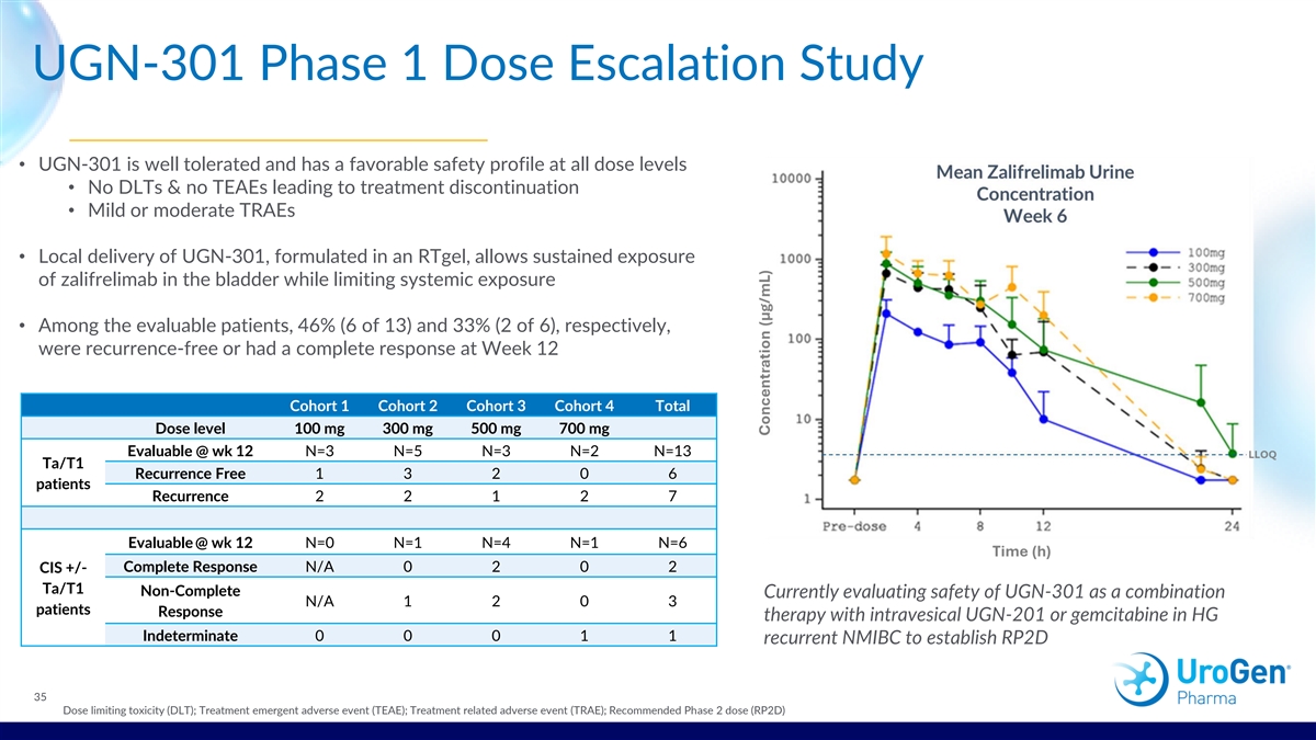 UGN-301 Phase 1 Dose Escalation Study • UGN-301 is well tolerated and has a favorable safety profile at all dose levels • No DLTs & no TEAEs leading to treatment discontinuation • Mild or moderate TRAEs • Local delivery of UGN-301, formulated in an RTgel, allows sustained exposure of zalifrelimab in the bladder while limiting systemic exposure • Among the evaluable patients, 46% (6 of 13) and 33% (2 of 6), respectively, were recurrence-free or had a complete response at Week 12 Cohort 1 Cohort 2 Cohort 3 Cohort 4 Total Dose level 100 mg 300 mg 500 mg 700 mg Evaluable @ wk 12 N=3 N=5 N=3 N=2 N=13 Ta/T1 Recurrence Free 1 3 2 0 6 patients Recurrence 2 2 1 2 7 Evaluable @ wk 12 N=0 N=1 N=4 N=1 N=6 CIS +/- Complete Response N/A 0 2 0 2 Ta/T1 Non-Complete Currently evaluating safety of UGN-301 as a combination N/A 1 2 0 3 patients Response therapy with intravesical UGN-201 or gemcitabine in HG Indeterminate 0 0 0 1 1 recurrent NMIBC to establish RP2D 35 Dose limiting toxicity (DLT); Treatment emergent adverse event (TEAE); Treatment related adverse event (TRAE); Recommended Phase 2 dose (RP2D)