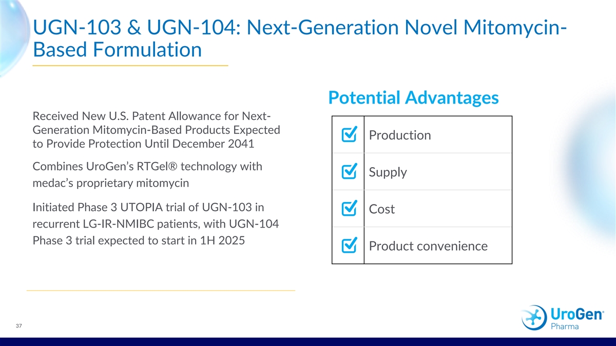 UGN-103 & UGN-104: Next-Generation Novel Mitomycin- Based Formulation Potential Advantages Received New U.S. Patent Allowance for Next- Generation Mitomycin-Based Products Expected Production to Provide Protection Until December 2041 Combines UroGen’s RTGel® technology with Supply medac’s proprietary mitomycin Initiated Phase 3 UTOPIA trial of UGN-103 in Cost recurrent LG-IR-NMIBC patients, with UGN-104 Phase 3 trial expected to start in 1H 2025 Product convenience 37