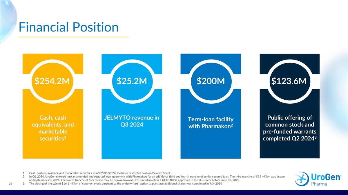 Financial Position $254.2M $25.2M $200M $123.6M Cash, cash JELMYTO revenue in Public offering of Term-loan facility 2 equivalents, and Q3 2024 common stock and with Pharmakon marketable pre-funded warrants 1 3 securities completed Q2 2024 1. Cash, cash equivalents, and marketable securities as of 09/30/2024. Excludes restricted cash on Balance Sheet 2. In Q1 2024, UroGen entered into an amended and restated loan agreement with Pharmakon for an additional third and fourth tranche of senior secured loan. The third tranche of $25 million was drawn on September 23, 2024. The fourth tranche of $75 million may be drawn down at UroGen’s discretion if UGN-102 is approved in the U.S. on or before June 30, 2025 3. The closing of the sale of $16.1 million of common stock pursuant to the underwriters' option to purchase additional shares was completed in July 2024 38