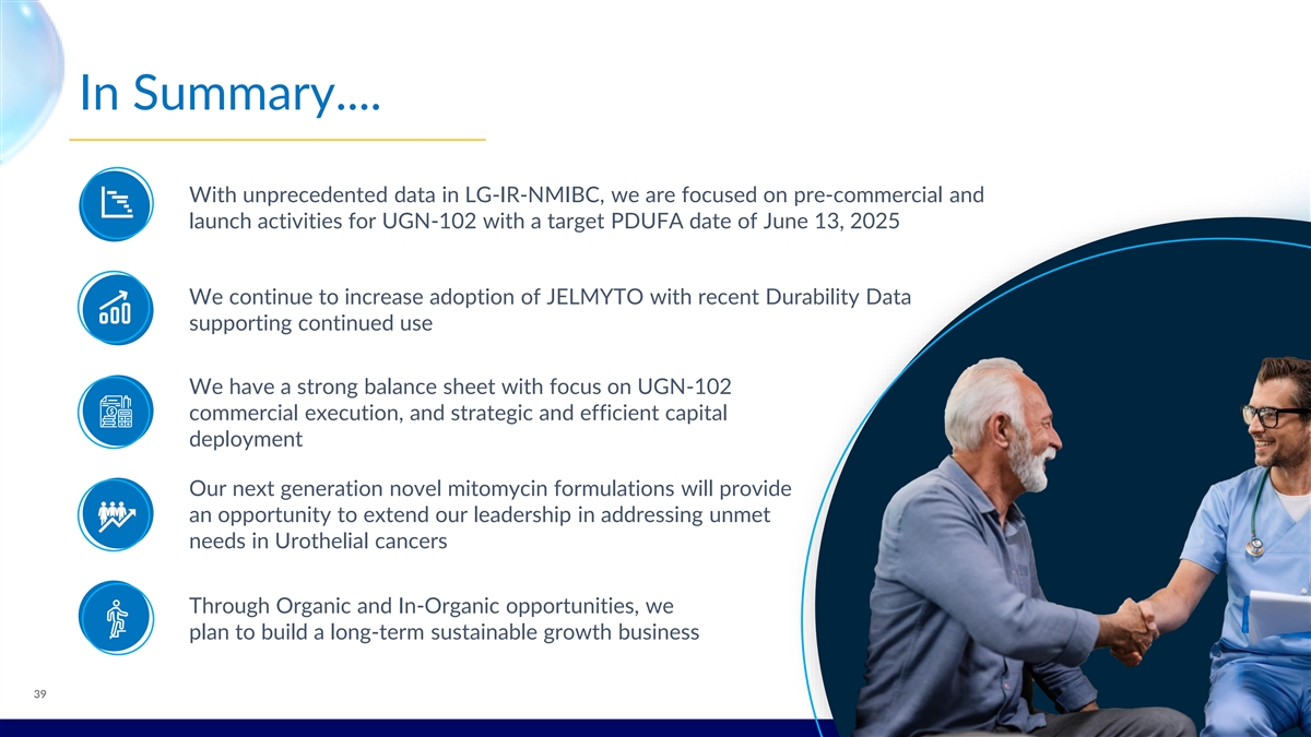 In Summary.... With unprecedented data in LG-IR-NMIBC, we are focused on pre-commercial and launch activities for UGN-102 with a target PDUFA date of June 13, 2025 We continue to increase adoption of JELMYTO with recent Durability Data supporting continued use We have a strong balance sheet with focus on UGN-102 commercial execution, and strategic and efficient capital deployment Our next generation novel mitomycin formulations will provide an opportunity to extend our leadership in addressing unmet needs in Urothelial cancers Through Organic and In-Organic opportunities, we plan to build a long-term sustainable growth business 39