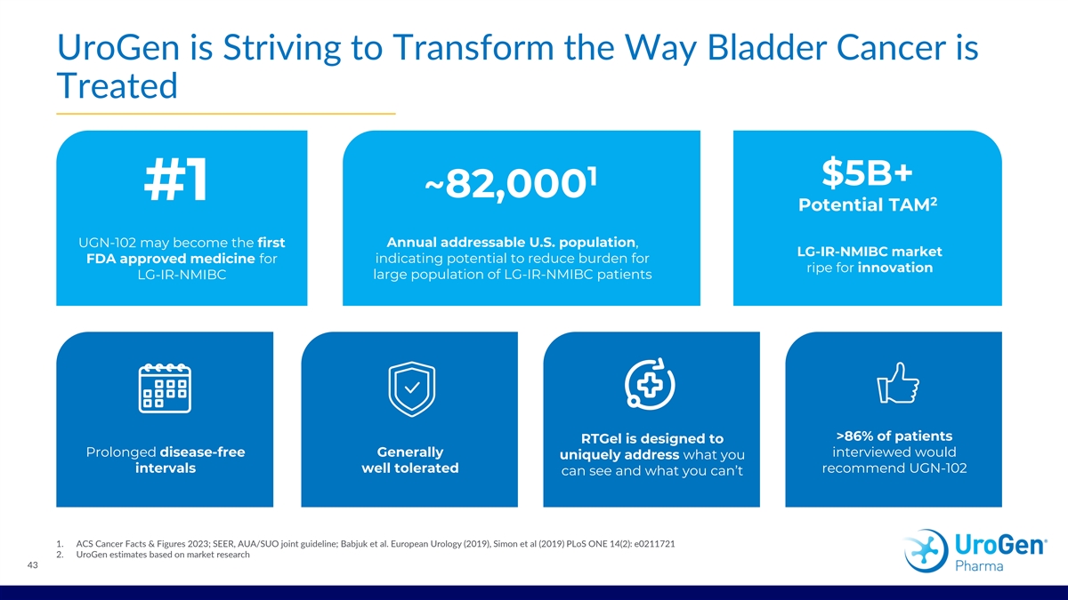 UGN-102 Potentially Addresses the Unmet Need for a Better Treatment Option 79.6% 82.3% (73.9, 84.5) (75.9, 87.1) Complete Response Rate Estimated probability of maintaining at 3 months durable response at 12 months Safety profile characterized primarily Non-surgical treatment with potential to by mild to moderate AEs reduce overall burden on patients UroGen Data on File 42