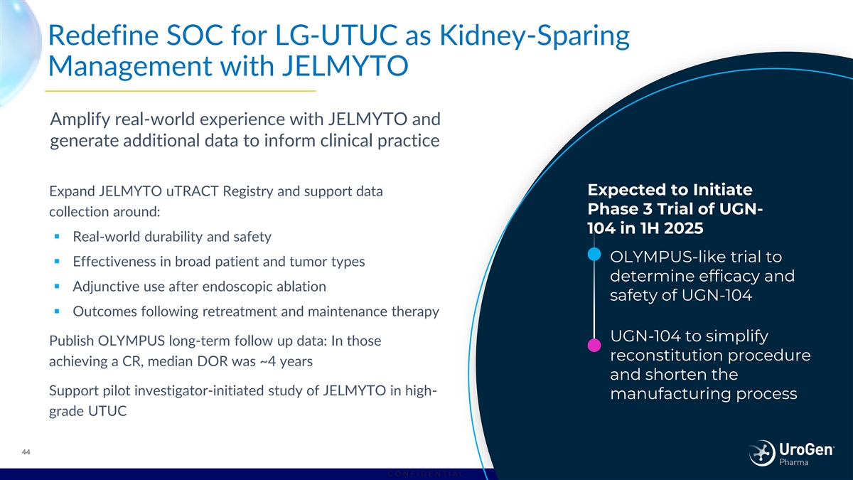 Redefine SOC for LG-UTUC as Kidney-Sparing Management with JELMYTO Amplify real-world experience with JELMYTO and generate additional data to inform clinical practice Expected to Initiate Expand JELMYTO uTRACT Registry and support data Phase 3 Trial of UGN- collection around: 104 in 1H 2025 ▪ Real-world durability and safety OLYMPUS-like trial to ▪ Effectiveness in broad patient and tumor types determine efficacy and ▪ Adjunctive use after endoscopic ablation safety of UGN-104 ▪ Outcomes following retreatment and maintenance therapy UGN-104 to simplify Publish OLYMPUS long-term follow up data: In those reconstitution procedure achieving a CR, median DOR was ~4 years and shorten the Support pilot investigator-initiated study of JELMYTO in high- manufacturing process grade UTUC 44 C O N F I D E N T I A L