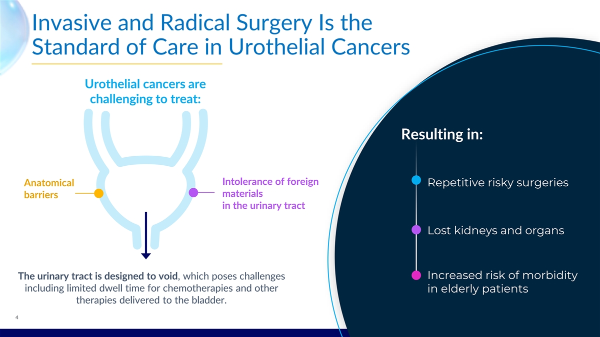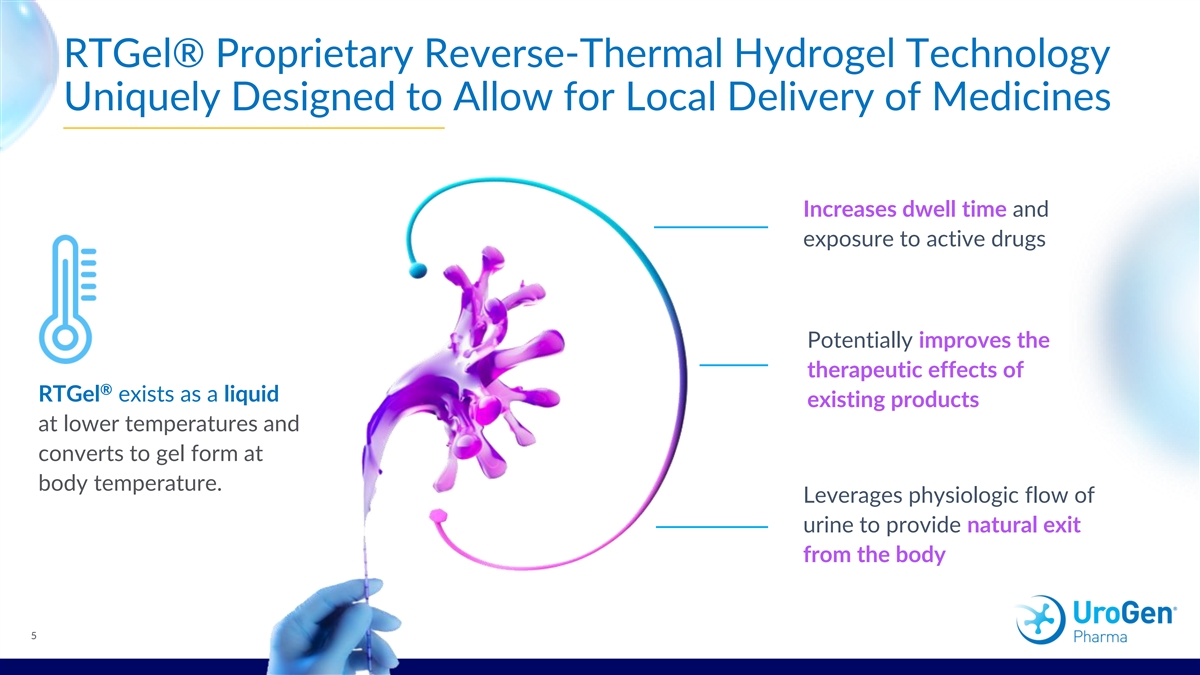 Invasive and Radical Surgery Is the Standard of Care in Urothelial Cancers Urothelial cancers are challenging to treat: Resulting in: Intolerance of foreign Anatomical Repetitive risky surgeries materials barriers in the urinary tract Lost kidneys and organs Increased risk of morbidity The urinary tract is designed to void, which poses challenges including limited dwell time for chemotherapies and other in elderly patients therapies delivered to the bladder. 4