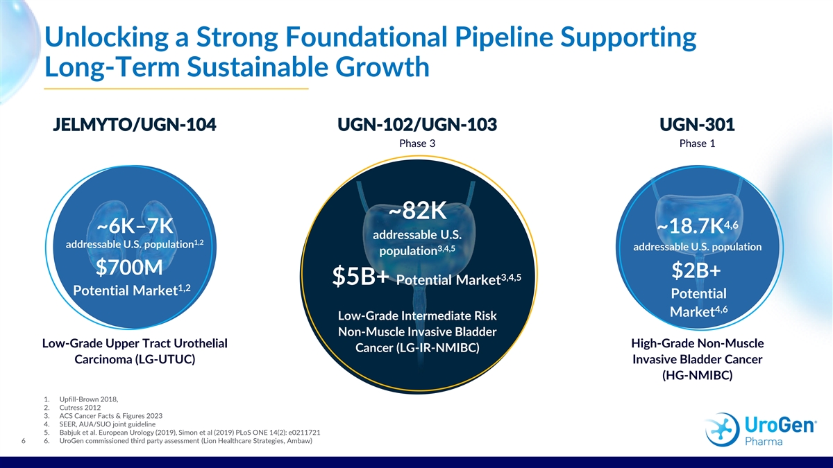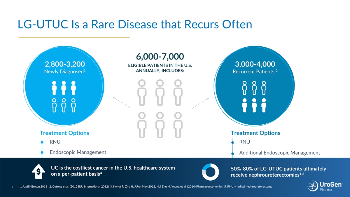 Unlocking a Strong Foundational Pipeline Supporting Long-Term Sustainable Growth JELMYTO/UGN-104 UGN-102/UGN-103 UGN-301 Phase 3 Phase 1 ~82K 4,6 ~6K–7K ~18.7K addressable U.S. 1,2 addressable U.S. population addressable U.S. population 3,4,5 population $700M $2B+ 3,4,5 $5B+ Potential Market 1,2 Potential Market Potential 4,6 Market Low-Grade Intermediate Risk Non-Muscle Invasive Bladder Low-Grade Upper Tract Urothelial High-Grade Non-Muscle Cancer (LG-IR-NMIBC) Carcinoma (LG-UTUC) Invasive Bladder Cancer (HG-NMIBC) 1. Upfill-Brown 2018, 2. Cutress 2012 3. ACS Cancer Facts & Figures 2023 4. SEER, AUA/SUO joint guideline 5. Babjuk et al. European Urology (2019), Simon et al (2019) PLoS ONE 14(2): e0211721 6 6. UroGen commissioned third party assessment (Lion Healthcare Strategies, Ambaw)